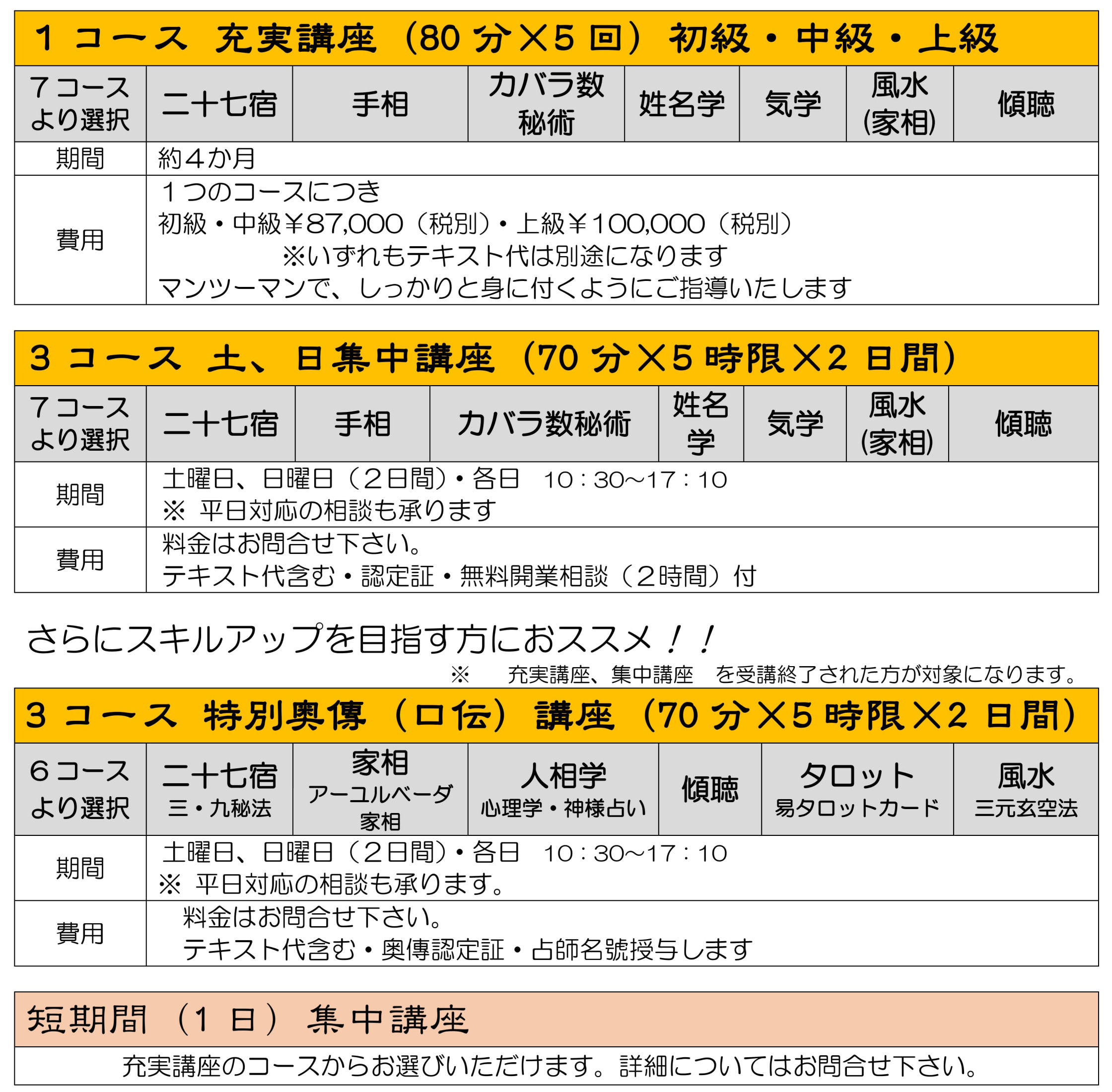 カバラ・タロット・人相・姓名学・手相・気学・風水・宿曜経二十七宿・傾聴などの講座があります。